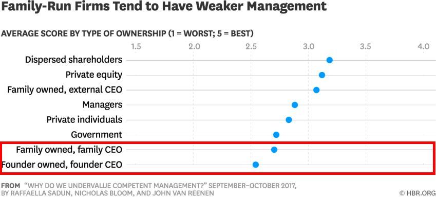 El siguiente grafico de la HBR (Harvard Business Review) revela que la constelación en la que el fundador, el CEO y el propietario recae en la misma persona es la peor que hay en cuanto a la gestión de las empresas. Peor incluso que las instituciones públicas de las que tanto nos quejamos todos…