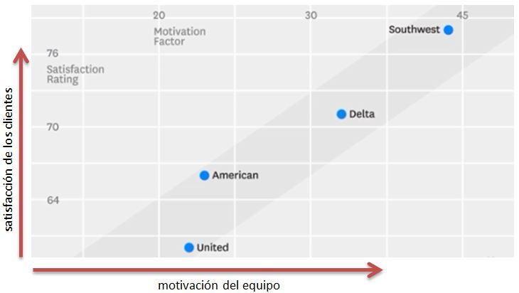 Un gráfico publicado en la Harvard Business Review muestra la correlación entre la motivación del equipo y la satisfacción de los clientes en el caso de las líneas aéreas en EEUU.