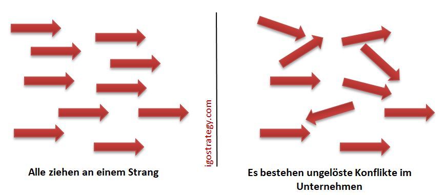 Wir sehen die (idealisierte) Darstellung eines Unternehmens, in dem alle an einem Strang ziehen, und zum Vergleich ein Unternehmen, in dem dies nicht der Fall ist. Hier gibt es eine Person (Pfeil), die ihre Arbeit nicht mag, und weitere Mitarbeiter, die ihre Anstrengungen und Aufgaben nicht in dieselbe Richtung lenken. Das kommt in mittelgroßen Unternehmen recht häufig vor.