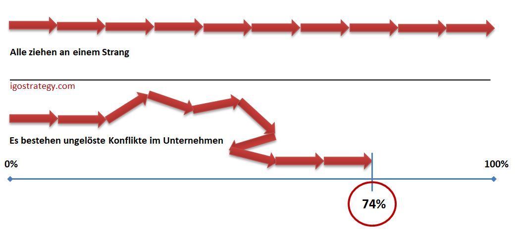 Wenn die Pfeile nicht alle in dieselbe Richtung zeigen, lässt sich bereits ein Effizienzverlust erahnen. Reiht man die Pfeile aneinander, sieht man deutlich und kann sogar messen, welche Auswirkungen es hat, wenn die Personen und Ressourcen des Unternehmens nicht selben Strang ziehen: