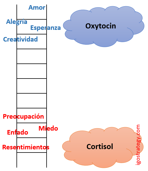 Necesitamos subir en la escalera de bienestar a la parte alta, donde están los sentimientos como la esperanza, la alegría y el amor. Al sentirlo nuestro cerebro vierte la oxitocina, también conocida como la hormona de la felicidad y relacionado con el sexo. Pero aquí no quiero hablar del sexo sino del impacto positivo que tiene en el trabajo y la oficina: aumenta nuestra confianza, nos prepara para ser más creativos e impulsa nuestra capacidad para relaciones sociales. Todos ellos efectos positivos para crear y mantener un equipo capaz de afrontar los retos de entornos de constante y rápido cambio que existen hoy para todas las empresas.